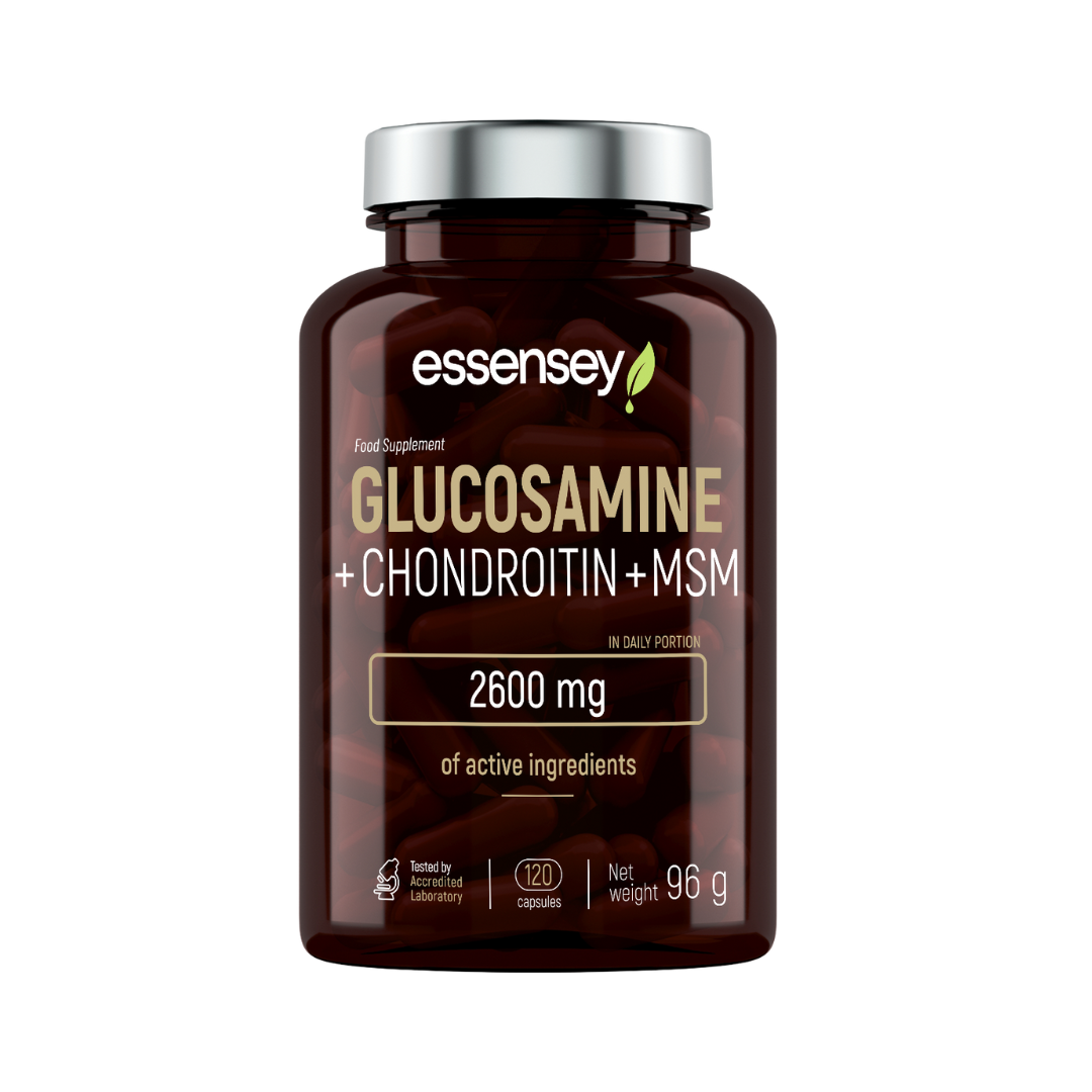 essensey ГЛЮКОЗАМИН + ХОНДРОИТИН + МСМ . Пищевая добавка. Продукт в капсулах, содержащий глюкозамина сульфат, хондроитина сульфат и метилсульфонилметан. 2600 мг активных ингредиентов в суточной дозе.